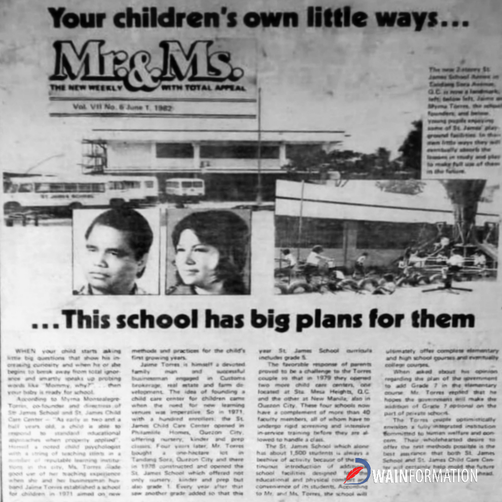 At first, Mr. Jaime T. Torres and Mrs. Myrna Montealegre-Torres co-founded St. James Child Care Center in Philamlife Homes, Quezon City, in 1971. The idea of a child care center came after the Torres couple realized the necessity for new learning venues at that time, so they set their sights on new methods and practices for the child’s formative years. Similarly, Mr. and Mrs. Torres envisaged having college courses in the fullness of time.