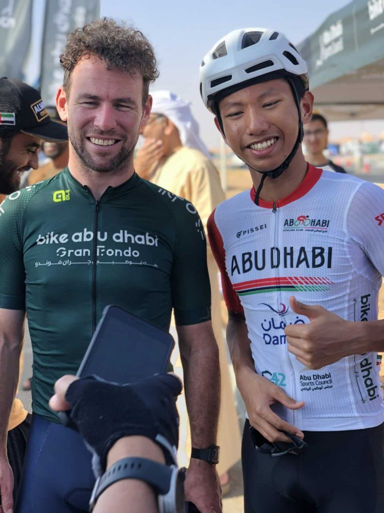 The Manx Missile, Mark Cavendish, 39, signed an autograph on a cycling jersey handed to him by Whelan Rab Itong in the Land of the Emirates.