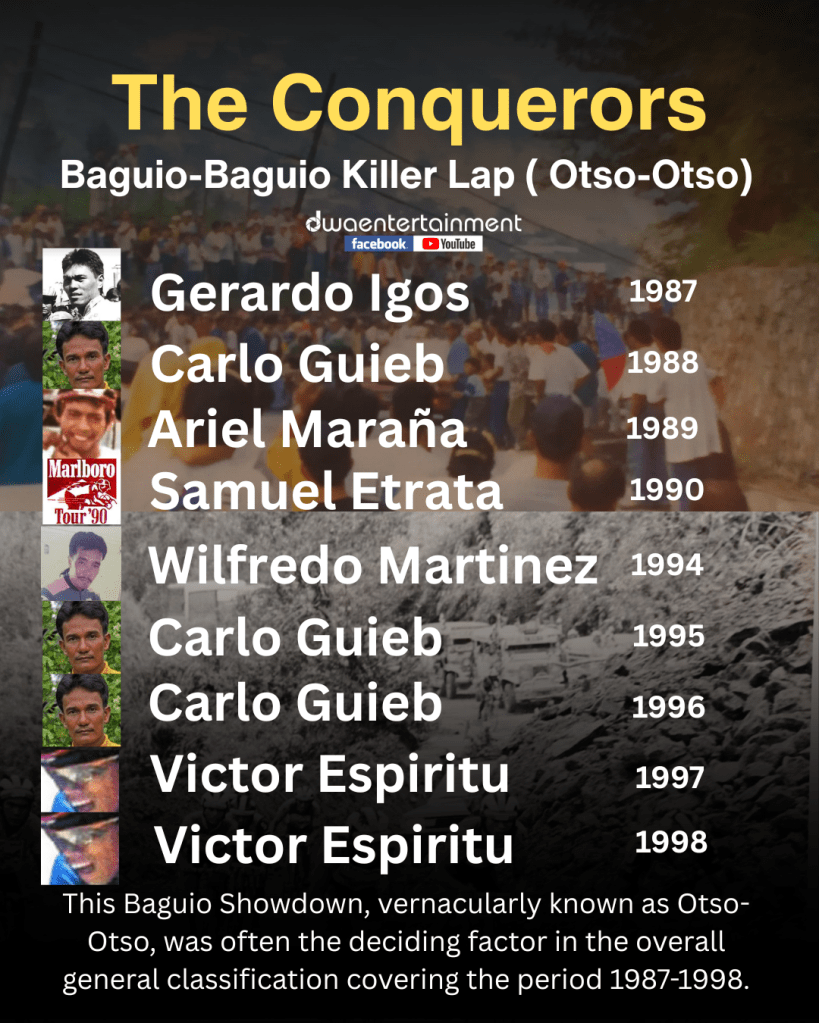 The Baguio-Baguio Killer Lap, vernacularly known as Otso-Otso, was often the deciding factor in the overall general classification of the Marlboro Tour during the period from 1987 to 1998.