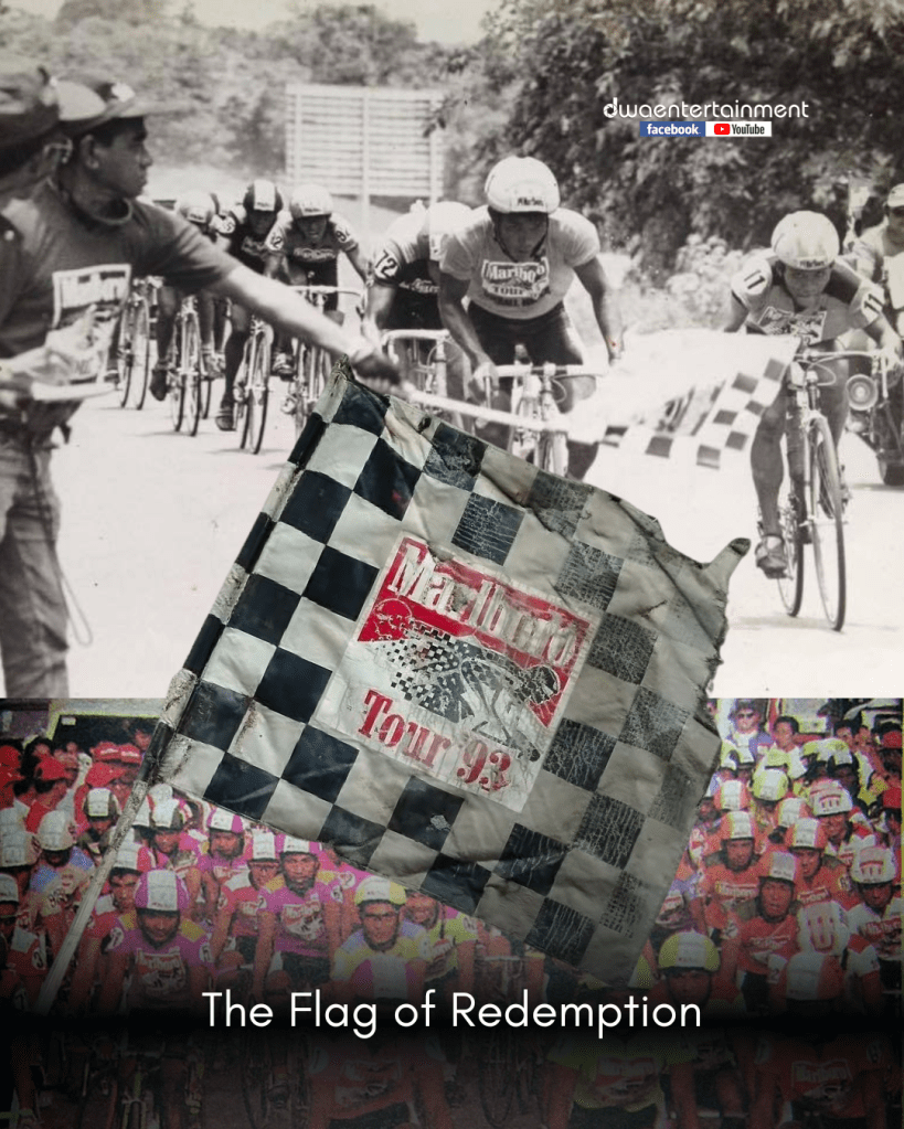 This tattered checkered flag—a battle-worn artifact from the golden era of Philippine cycling—is more than just fabric. It is a symbol of Carlo Guieb’s redemption arc, two years after losing the 1991 title to the ‘science-driven’ champion Bernie Llentada by a heartbreaking 1 minute and 56 seconds.