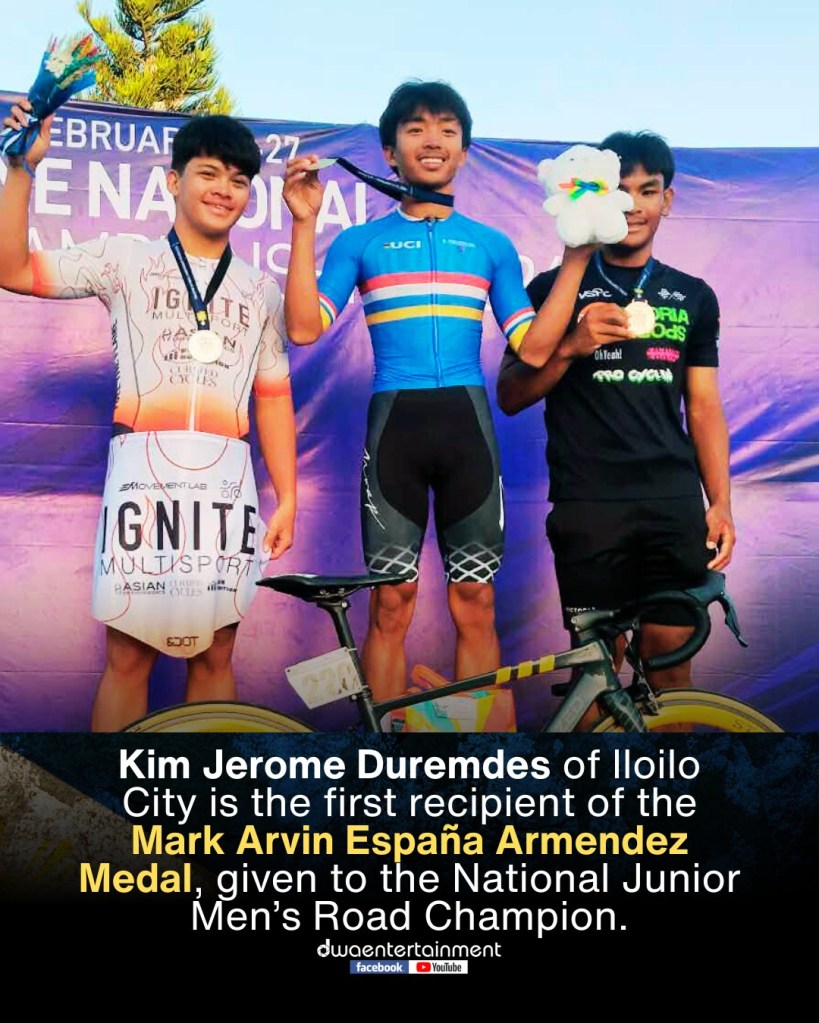 Historically, Kim Jerome Duremdes of Iloilo City is the first recipient of the Mark Arvin España Armendez Medal, awarded to the National Junior Men’s Road Champion.